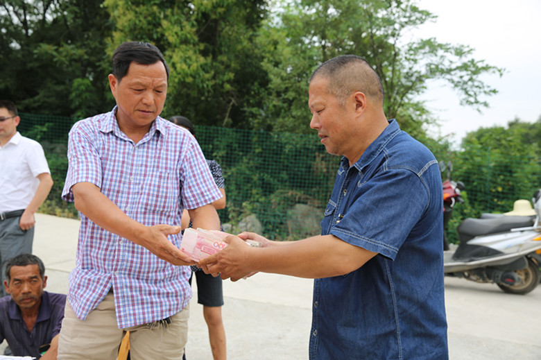 8月10日,筆者來到石門縣磨市鎮(zhèn)鮑家渡村,踏訪這家全省規(guī)模最大的現(xiàn)代化家禽扶貧養(yǎng)殖基地,恰巧碰上首批飼養(yǎng)的石門土雞正在出欄。10多輛運(yùn)雞車在云繚霧繞的山間公路上穿梭,20多位貧困戶組成的抓雞裝雞隊(duì)伍忙個(gè)不停。詢問他們一天的收入情況,一位60多歲的老農(nóng)笑著說:“雞場(chǎng)是按抓雞的總重量算的,一公斤9分錢,我昨天拿到110元,今天應(yīng)該還多些?!?/span>