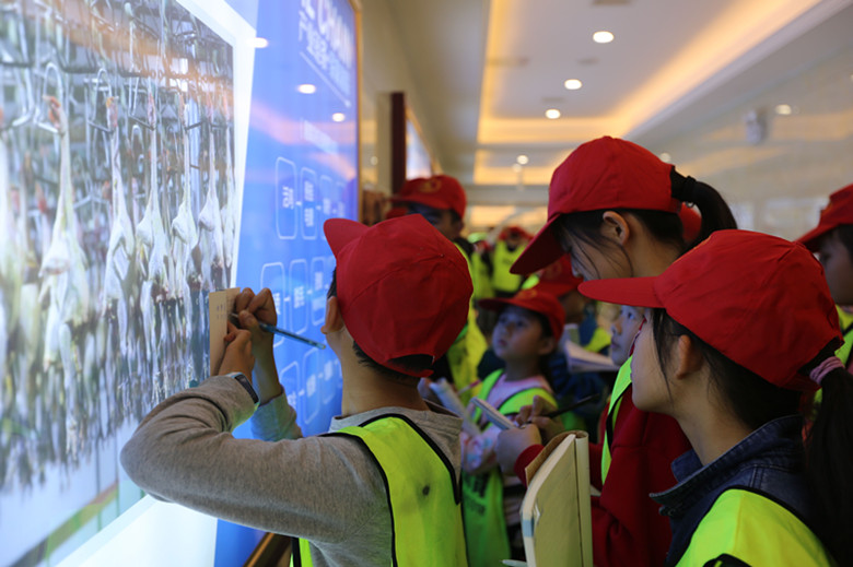 看著湘佳文化長廊櫥窗里的屠宰流程和兩位創(chuàng)始人喻自文、邢衛(wèi)民的創(chuàng)業(yè)事跡,學生們不約而同地拿出紙和筆記下,說這是最好的寫作素材和知識要點。