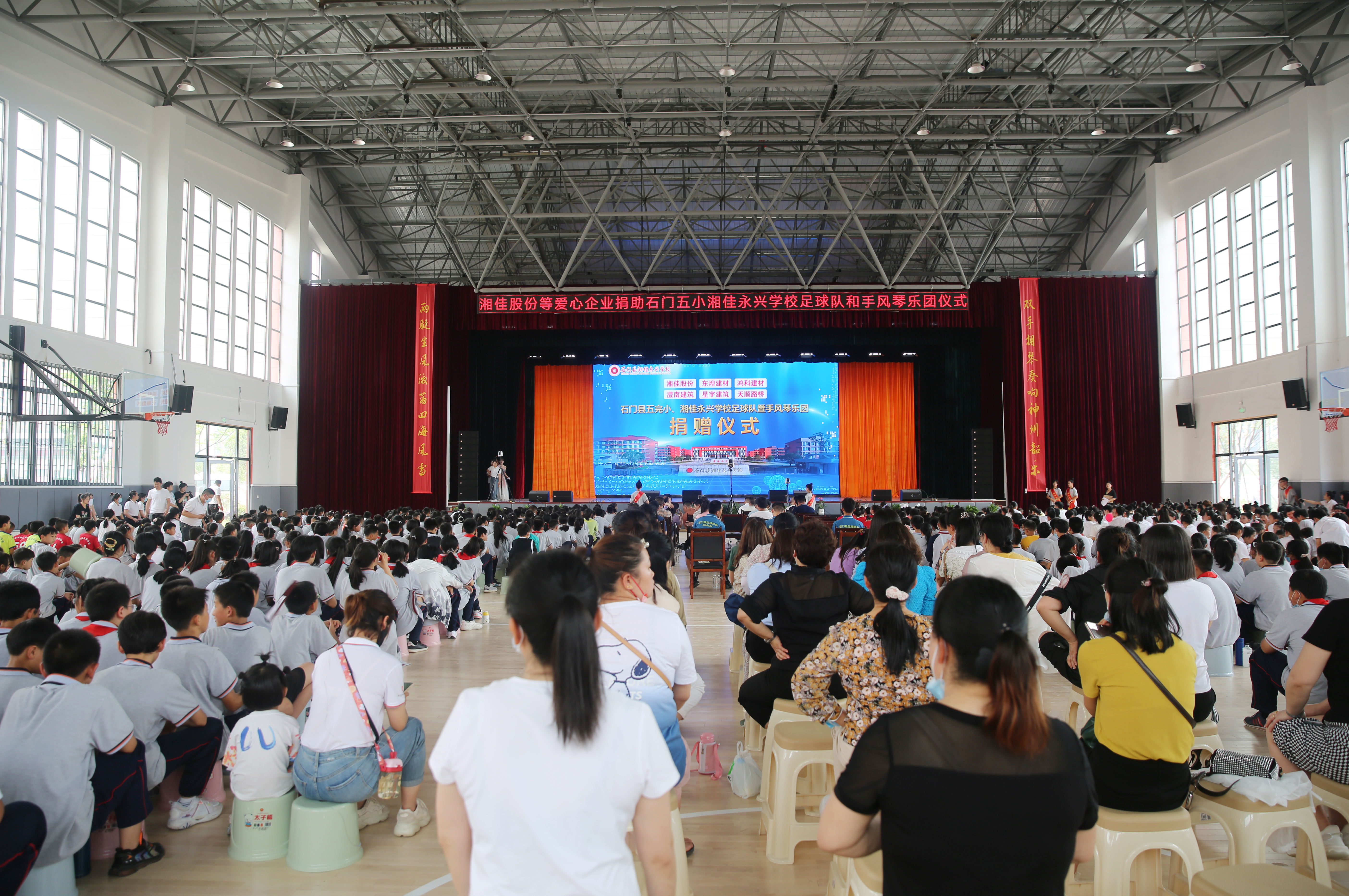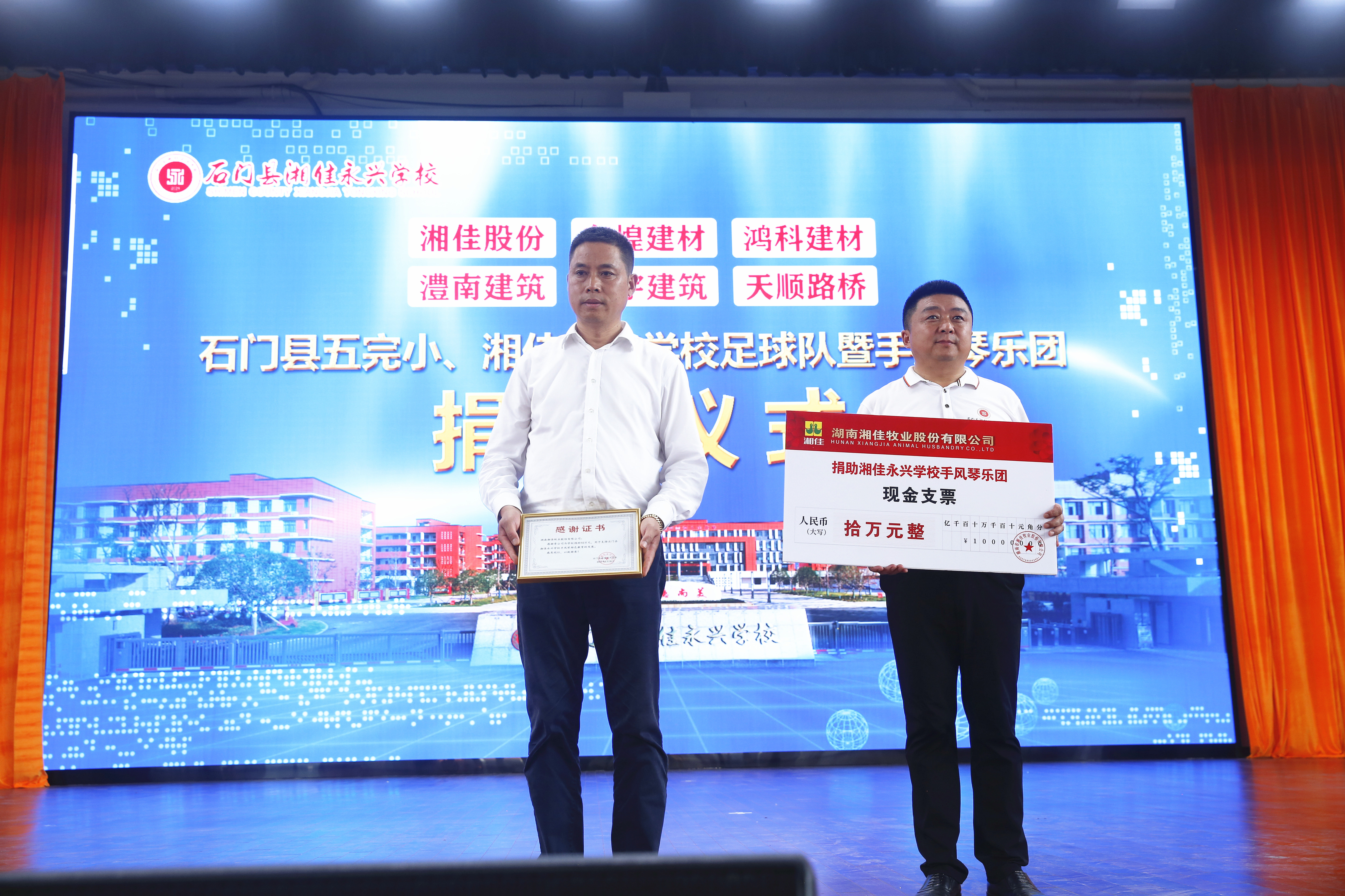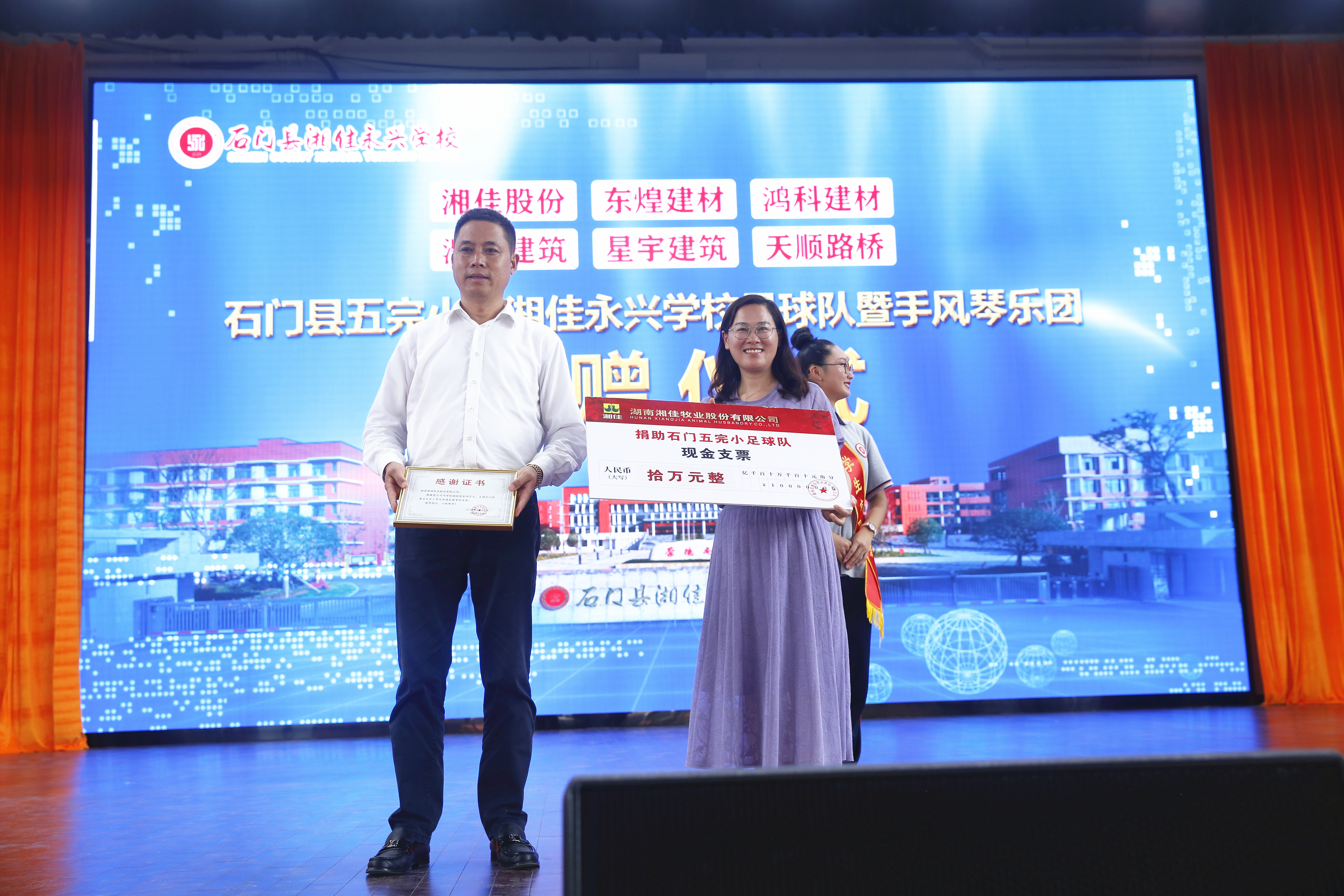 5月30日下午,湖南省石門縣五完小足球隊、湘佳永興學(xué)校手風(fēng)琴樂團收到來自石門本土上市企業(yè)湘佳股份和石門本土知名企業(yè)東煌建材、鴻科建材、澧南建筑、星宇建筑、天順路橋捐贈的共計40萬元“厚禮”。